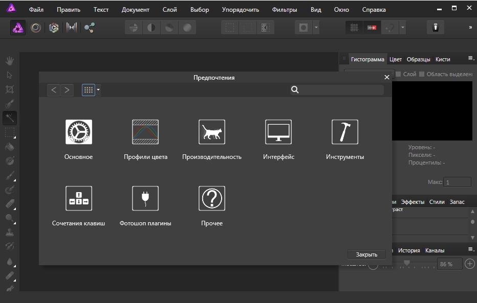 — основной образ. Интерфейс тут максимально похож на «типичные» графические пакеты. Слева расположена панель инструментов, которых в программе очень много, тут есть практически все знакомое по Photoshop, так что «скучать» по недостатку инструментов не придется. Справа размещены панели настроек: история, слои, гистограммы и многое другое. Их можно отделять и по желанию перегруппировывать.